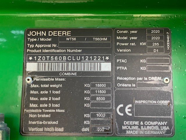 21 REG JOHN DEERE T560i HILLMASTER COMBINE. 40KPH PRODRIVE TRANSMISSION, DUAL RANGE CYLINDER & FAN DRIVE, 10000 LITRE GRAIN TANK, FOLDING 6.5 METRE UNLOADING AUGER, CHAFF SPREADER & STRAW CHOPPER, AT READY & ACTIVATED. ON 680/85R32 & 480/80R26 TYRES. OFFERED WITH 2023 625R HEADER & TROLLEY.