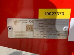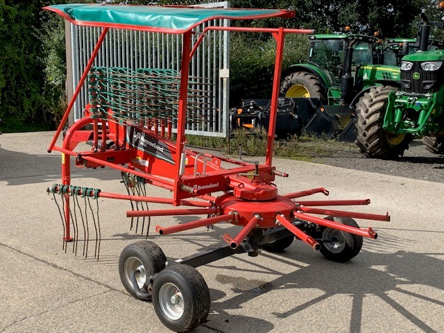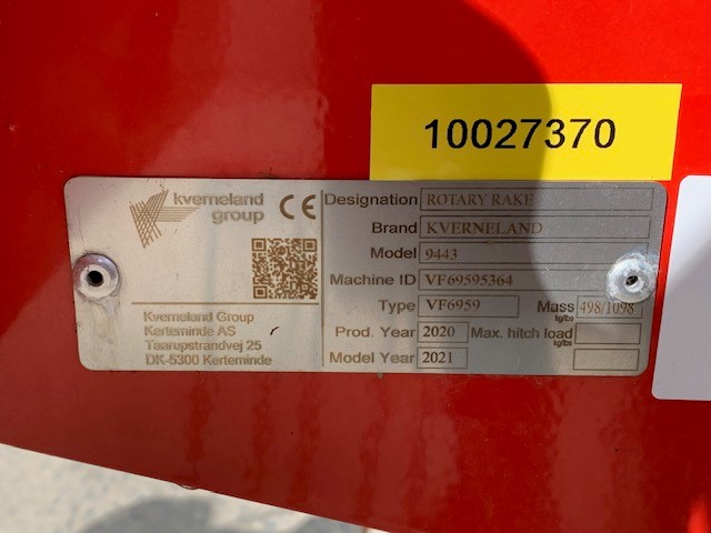 2021 KVERNELAND 9443 SINGLE ROTOR RAKE. 4.3 METRE WORKING WIDTH, 12 REMOVEABLE TINE ARMS WITH 4 DOUBLE TINES PER ARM, 4 SUPPORT WHEELS WITH TANDEM AXLES. VERY LIGHT USE & IN IMMACULATE CONDITION.