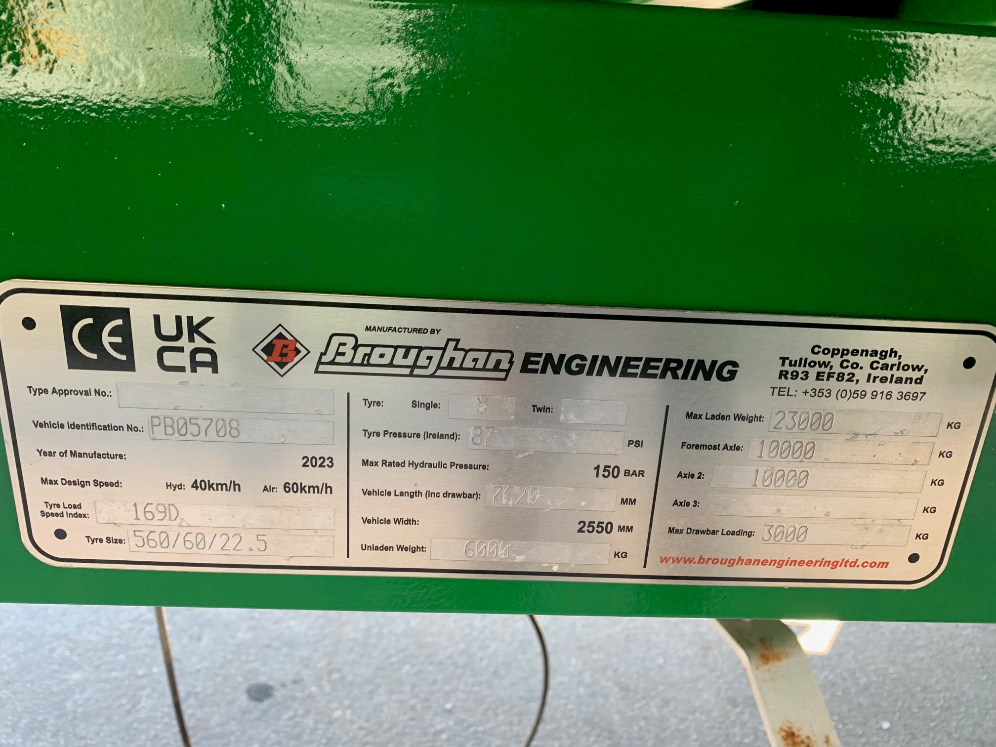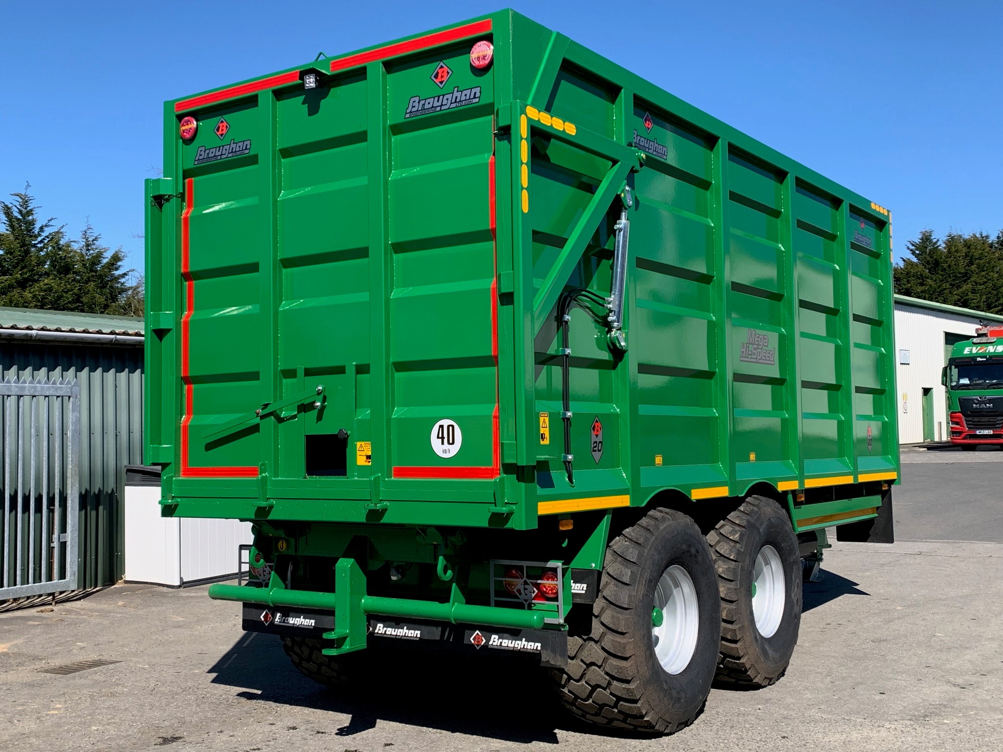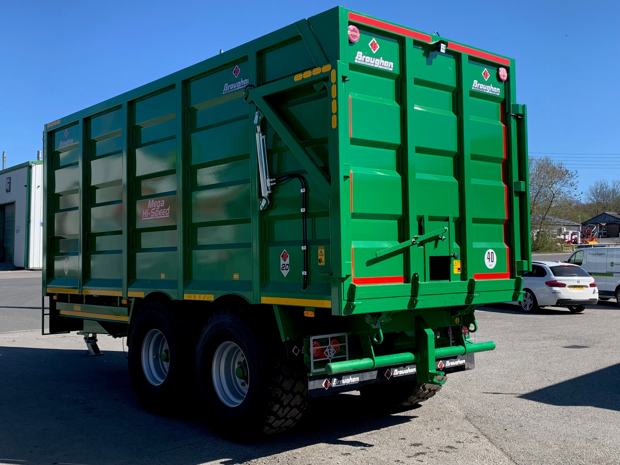 NEW BROUGHAN 18 TON SILAGE TRAILER. ONE PIECE 20'x 8'x 7'6" BODY, 10 STUD COMMERCIAL AXLES WITH AIR & HYDRAULIC BRAKES, 560/60R22.5 BKT FLOTATION TYRES, GRAIN CHUTE, FLASHING BEACON, HYDRAULIC TAILGATE, PERSPEX VIEWING WINDOW, REAR HITCH AND ELECTRICS. FINISHED IN JOHN DEERE GREEN.
